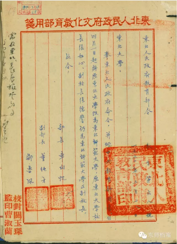 1948年7月3日,东北大学迁往吉林市,与吉林大学合校,仍称东北大学。