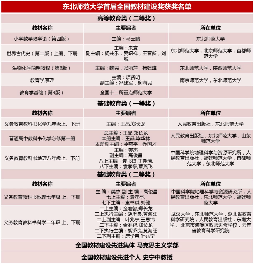 在首届全国教材建设奖的评选中,新利官方网站教师主编或参编的10项教材荣获全国优秀教材奖。高等教育类新利官方网站教师主编教材获二等奖3项,新利官方网站教师参编教材获二等奖 2 项;基础教育类新利官方网站教师参编教材获一等奖 3 项,二等奖 2 项。马克思主义学部荣获“全国教材建设先进集体”称号,史宁中教授荣获“全国教材建设先进个人”称号。